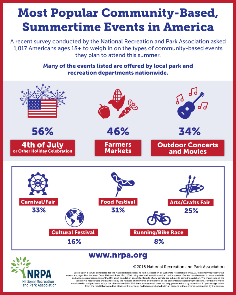 Ashburn, Va. (June 30, 2016) — During the summer, many Americans participate in events and festivals organized by their local communities — often by their local park and recreation departments. A recent online survey conducted by the National Recreation and Park Association(NRPA) found that the most popular community-based, summertime events include Fourth of July celebrations, farmers markets and outdoor movies/concerts.