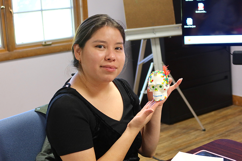 A participant shows her decorated sugar skull in preparation for Día de Muertos (Day of the Dead). Photo courtesy of Waukegan Park District.