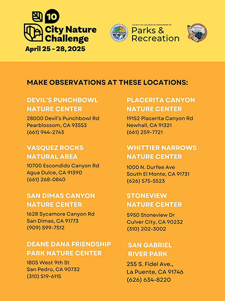 As both a steward of public parkland and a leading provider of nature-based education, the Los Angeles County Department of Parks and Recreation (DPR) plays a key role in connecting residents with the natural world. In support of CNC, DPR is hosting events at nature centers and natural areas throughout the region. These sites — including Devil’s Punchbowl in Pearblossom, Placerita Canyon in Newhall, Vasquez Rocks in Agua Dulce, and several others — offer exciting, welcoming spaces for visitors to explore and document nature.
