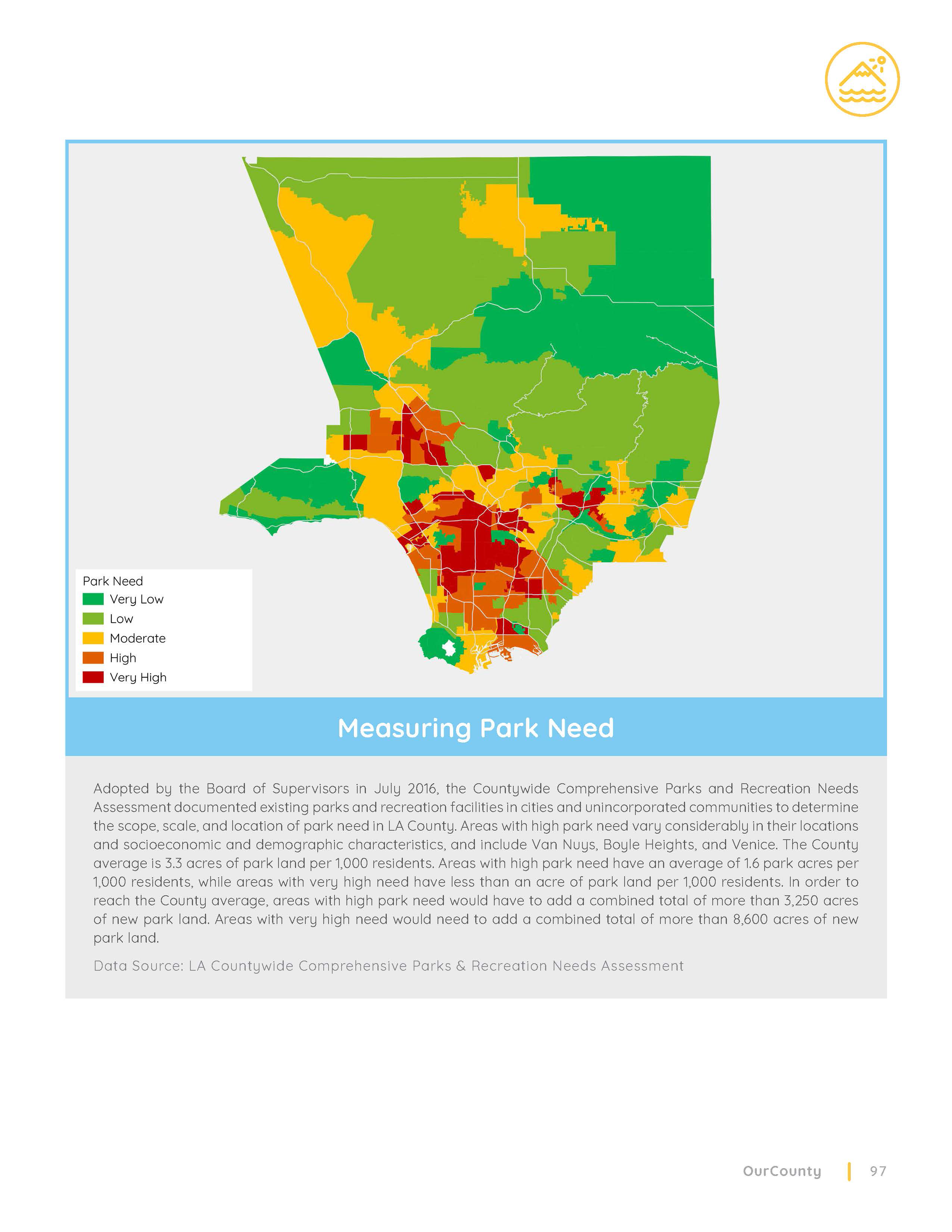 The OurCounty Plan emphasizes the importance of parks as green infrastructure that provides critical ecosystem services. In alignment with L.A. County’s Parks Needs Assessments, the plan calls for the creation and expansion of green spaces, particularly in underresourced communities that lack access to parks and open spaces (see this page, which shows how the Countywide Parks Needs Assessment is integrated into the plan). By increasing the number, size, and variety of parks, L.A. County aims to improve air and water quality, reduce heat islands, and enhance biodiversity across the region.