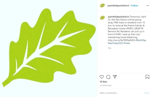 Talk about curbside service! Plainfield Park District in Illinois is giving free trees to people in their community on Earth Day so they can plant them in a couple of days on Arbor Day, April 24. To maintain proper physical distancing, community members can pull right up to the front of the recreation center and get their tree!