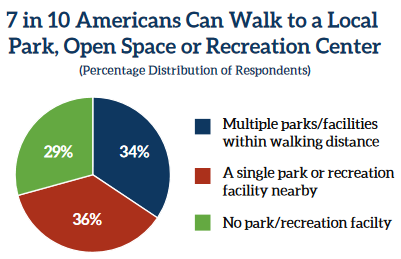 Those boots are made for walkin’, but can they get you to your local park or recreation center? For seven in 10 Americans, the answer is yes. Results from the recently released annual Americans’ Engagement with Parks survey show a large majority (70 percent) of Americans say they can walk to at least one local park, open space or recreation center and 34 percent say multiple parks or facilities are within walking distance. For those living in the Northeast, Midwest, and West regions, this number rises to 75 percent. Yet those that live in the South are less lucky, where only three in five respondents live within a walkable distance of a park or recreation facility.