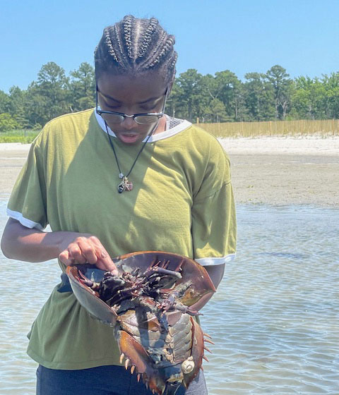 Pictured: A participant in the Green Jobs Program studies a horseshoe crab. Photo Credit: Martha Corrozi Narvaez