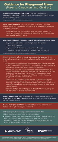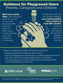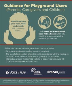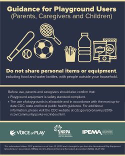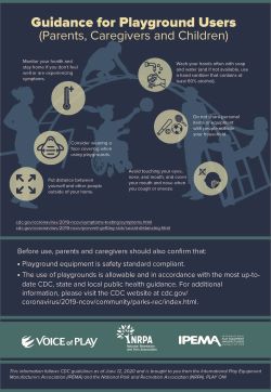 CDC has issued guidance for hot tubs, water playgrounds or water parks. According to CDC, “There is no evidence that the virus that causes COVID-19 can spread directly to humans from water in pools, hot tubs or spas or water play areas. Proper operation, maintenance and disinfection (for example, with chlorine or bromine) of pools, hot tubs or spas, and water playgrounds should kill the virus that causes COVID-19.” While this means that regular operation, maintenance and disinfection should kill the virus, park and recreation professionals should establish detailed plans in partnership with local public health and government officials that allow for the safe reopening of these spaces.