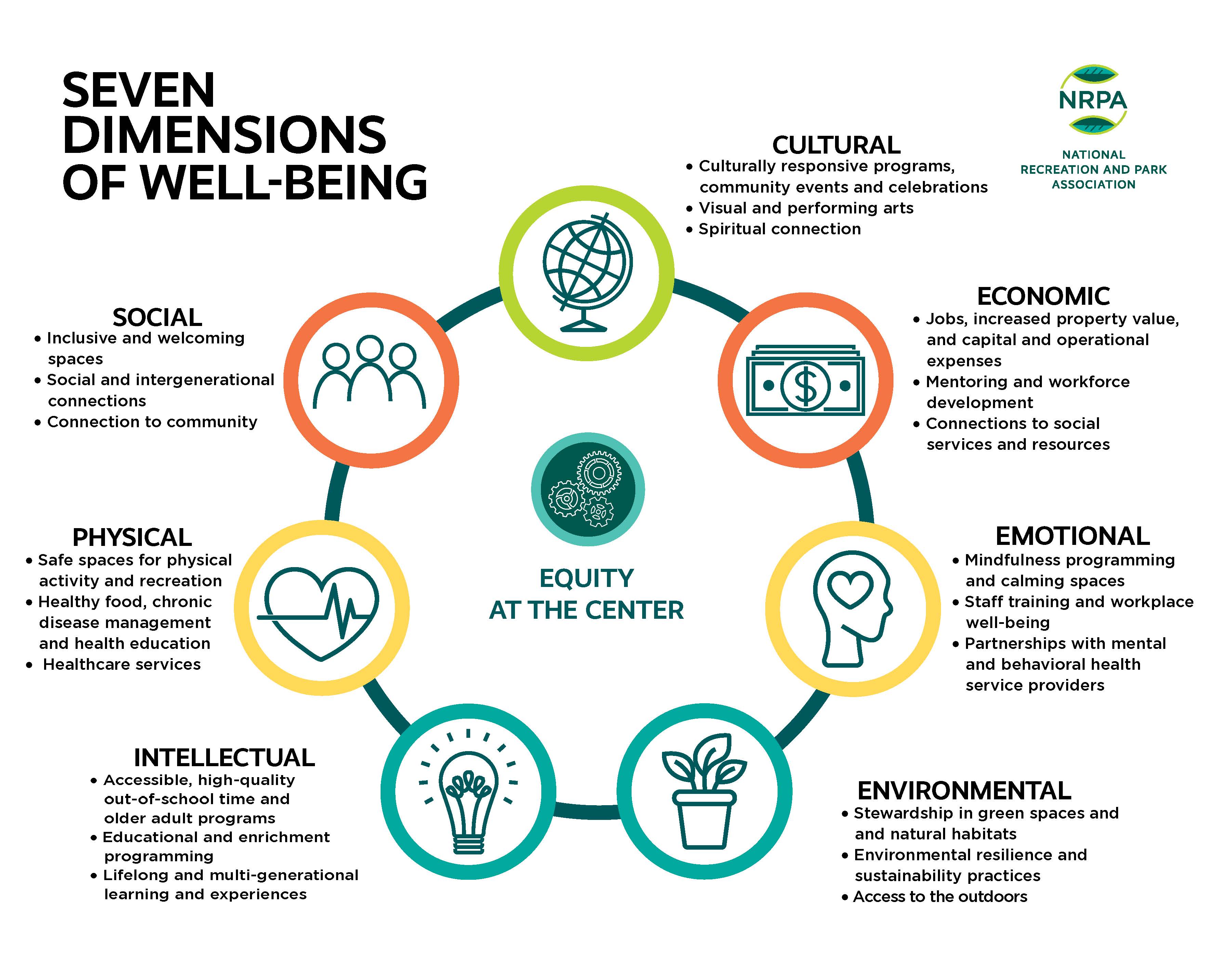 NRPA’s seven dimensions of well-being are adapted from several evidence-based frameworks and aligned with the strengths, assets and opportunities that exist within parks and recreation to advance access for all, resilience and health and well-being. The seven interdependent and interconnected dimensions of well-being include: cultural, economic, environmental, intellectual, mental, physical, and social. At the center of these seven dimensions is access for all, reflecting a deep commitment to addressing and rectifying legacies of unfair and injustice in our communities — especially those created and/or perpetuated through park and recreation systems — to ensure the benefits of parks and recreation are shared by everyone.