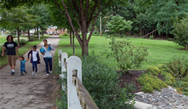 Green infrastructure is the natural and built green spaces that use natural processes to manage wet-weather in ways that improve a community’s well-being, including improving water quality, reducing flood risk, shielding from extreme heat, providing cleaner air and enhancing wildlife habitat. Examples of common green infrastructure found in parks include green roofs, trees, bioswales, rain gardens and permeable pavement.