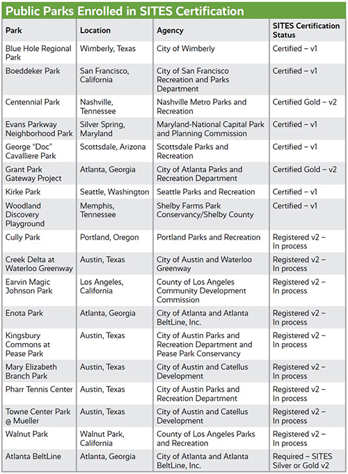 As parks are called on to do more under increasingly tight fiscal constraints, municipal policymakers, parks officials and advocates may find SITES to be a useful off-the-shelf tool to advance parks, recreation and environmental conservation efforts that enhance the quality of life for all people.