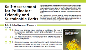 Parks and Pollinators: Taking Action and Advancing Sustainability can help park and recreation professionals develop a process to assess, identify and develop the teams, practices and efforts needed to advance your pollinator and sustainability efforts. This resource also provides a self-assessment worksheet to examine work being done and a chart to inventory potential partners that can be found here: