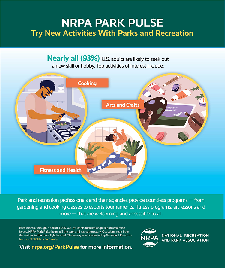 Parks and recreation prioritize providing a diverse range of spaces and resources to accommodate various hobbies and interests. Most U.S. adults are likely to seek out cooking, fitness and health, and arts and crafts classes. Parents are more likely to choose cooking and arts and crafts compared to non-parents. Moreover, men are more interested in advancing their skills in technology and history than women while women are more likely to engage with arts and crafts, gardening and photography.