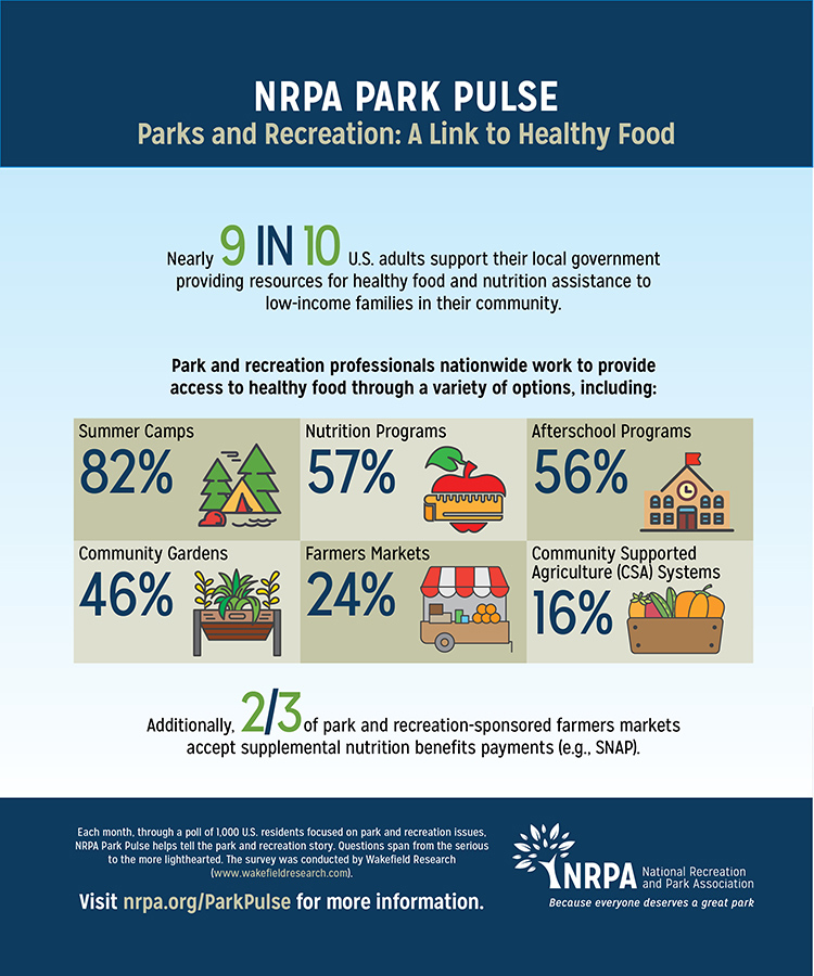 Nine in 10 U.S. adults support their local government providing resources for healthy food and nutrition assistance to low-income families in their community. Park and recreation professionals and their agencies fill the role of nutrition provider to many adults and children, a responsibility of increased importance in the face of funding cuts in social assistance programs.