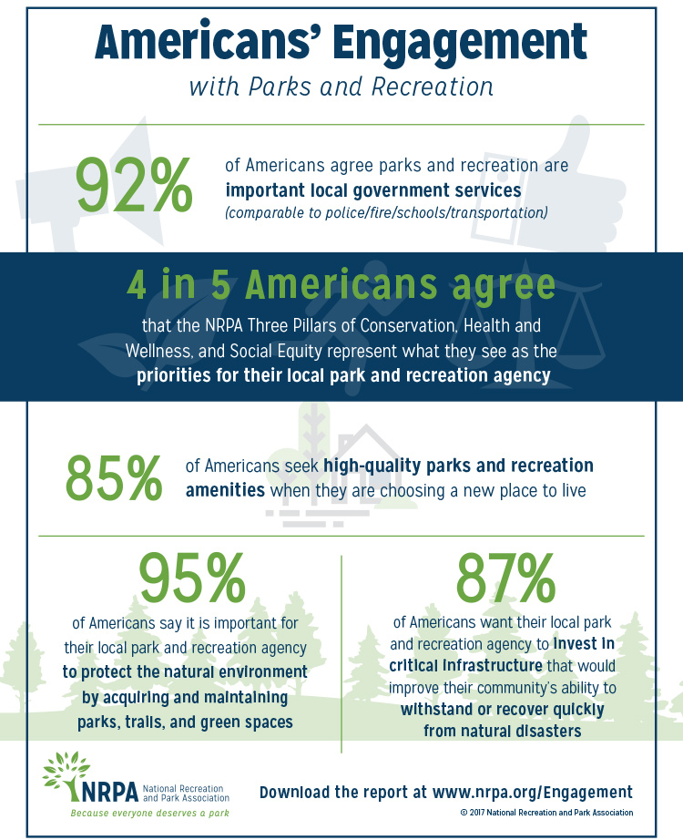 Each year, NRPA conducts a study exploring the public's relationship with their local parks. This study examines the essential nature of local parks and recreation, including how parks play a role in deciding where to live, the number of local parks, trails and other open spaces within easy access to people's homes, and the public's desire for local and state governments to sufficiently fund their local park and recreation agencies. The 2022 Engagement With Parks Report examines the role of parks and recreation in everyday life including the public's desire for the vital services agencies bring to the community such as emergency shelters and youth employment.