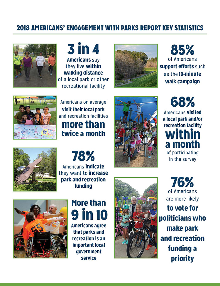 Similar to the 2019 report, the 2018 study probes the importance of public parks in peoples’ lives, including how parks rate against other service offerings of local governments. In addition, the 2018 study addresses the level of interest in improving easy access to high-quality parks and recreation facilities, including the public’s support of local officials who advocate for parks and increased funding for them.