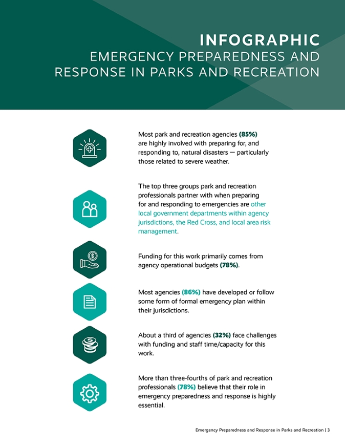 With the rise of extreme weather events and natural disasters, the role of park and recreation agencies on the front lines is more critical than ever. To better understand and support this important work, the National Recreation and Park Association (NRPA) surveyed park and recreation agencies about their roles in the current landscape of emergency preparedness and response. This report highlights the experiences of, and the challenges and opportunities for, park and recreation professionals in emergency situations.