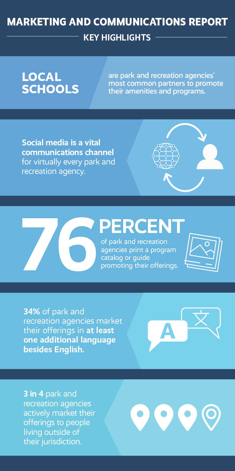 Marketing and communicating what park and recreation agencies offer to a community is a significant challenge, especially in a competitive marketplace and often with limited resources. To learn more about how park and recreation leaders are facing these challenges and the strategies being implemented in the field, the NRPA Research team conducted a 24-question survey on the topic of marketing and communications at park and recreation agencies nationwide. This survey asked leaders about marketing and communications goals, their partners and the resources they tap. The survey generated more than 400 responses from agencies of all sizes throughout the United States, the data from which are the basis of this report.